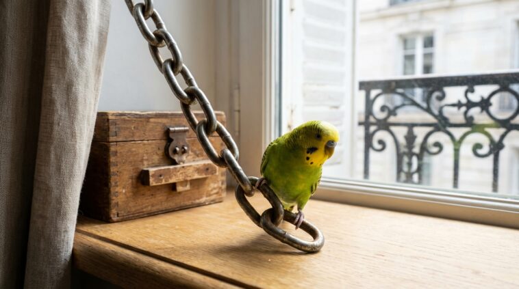 C’est l’un de ces drames tristement classiques dont on se passerait bien dans le monde aviaire. La plupart des propriétaires achètent des balançoires et des échelles sans accorder la moindre attention à la quincaillerie qui les lie. Pourtant, les anneaux et chaînes mal dimensionnés provoquent des coincements redoutables. Qu’il s’agisse d’un espace d’un demi-millimètre ouvert sur un maillon en plastique bas de gamme ou d’une attache de fixation inadaptée, le bout du doigt ou la griffe de la perruche finit invariablement par s’y faufiler. Une fois l’oiseau piégé, il panique. Il tente de s’envoler ou se laisse pendre, générant une torsion mécanique immédiate de la phalange captive.