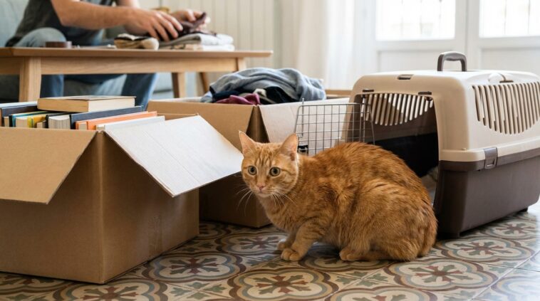 Le stress du déménagement n’est pas seulement lié au nouveau lieu. Il commence souvent bien avant, avec les bruits (ruban adhésif, portes qui claquent, aspirateur), l’agitation (allées et venues, visiteurs, déménageurs) et les micro-absences (courses, démarches, trajets répétés). Un chat peut tolérer une nouveauté. Mais une accumulation de nouveautés, c’est une autre histoire.