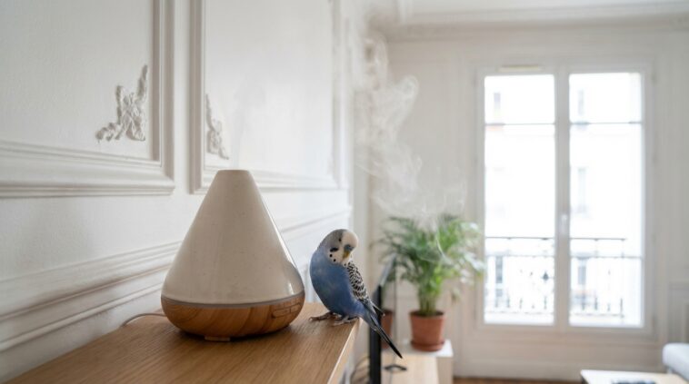 Le cynisme de notre époque veut que l’on nettoie l’air en y pulvérisant des produits chimiques. Diffuseurs d’huiles essentielles et sprays parfumés provoquent irritation respiratoire et détresse chez les perruches. Cette réalité cruelle est trop souvent ignorée. Les gouttelettes microscopiques projetées dans la pièce, censées masquer les odeurs du quotidien, s’apparentent à une pluie acide pour ces créatures fragiles.