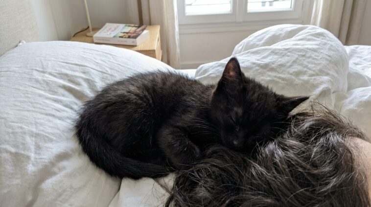 L’anxiété durant la nuit ne concerne pas seulement les humains. Pour s’apaiser, le chat fait confiance à son odorat très développé. Le cuir chevelu comme le visage humain sont riches en glandes sébacées, sources de phéromones familières et rassurantes. Leur empreinte olfactive procure au chat un effet apaisant. Par ailleurs, la douceur de votre souffle et le rythme régulier de votre cœur, perceptibles à cette proximité, créent un environnement sonore propice à la détente et au sentiment de sécurité.